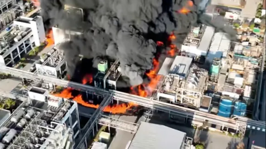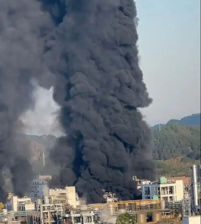 根据网友提供的视频显示,在靠近山体一侧的企业车间里,一股巨大的黑烟直冲天际,黑烟底部能看到明显的明火。随后,附近工地、企业工作人员开始紧急撤离。