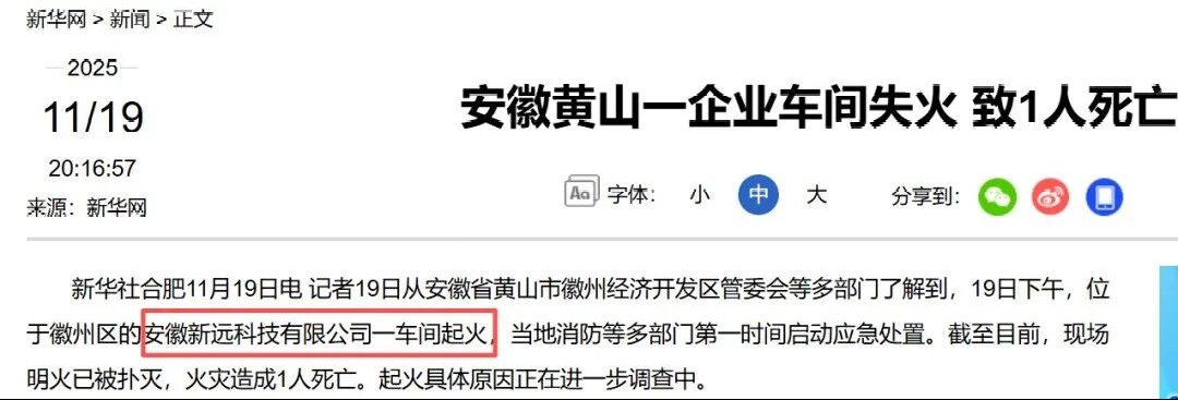 11月19日,徽州经济开发区管委会通报称当日15时17分,安徽新远科技有限公司一车间起火,徽州区第一时间启动应急处置,目前火势已控制。具体原因,正在进一步调查中。