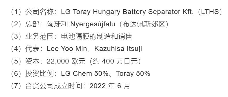 据悉,LTHS成立于2022年6月,是东丽与LG化学在匈牙利各持股50%的合资企业,主要生产和销售用于锂离子二次电池(LIB)的电池隔膜。